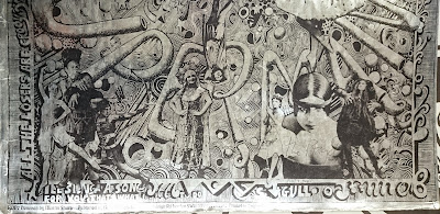The Donovan piece was a tribute poster, which I did as an admirer of his songs. There was a photograph central to that, and then I cut up some old Sketch magazine for the theatrical figures around the edges. The artwork was done at actual size, and I just started off and followed my nose, really. I would often work on Kromekote so you could scratch off mistakes, but often my mistakes led to my effects, because I'd accidentally drop spots of ink on my drawings. I'd leave the ink blots and work around them. The same for my Dylan poster .... In London, I had a wonderful printer, Peter Ledeboer, who was printing OZ. He loved the idea of doing posters; he was a great publisher for me. And I really loved the effect of foil, so we printed on foil stock. (Electric Banana, 39)
